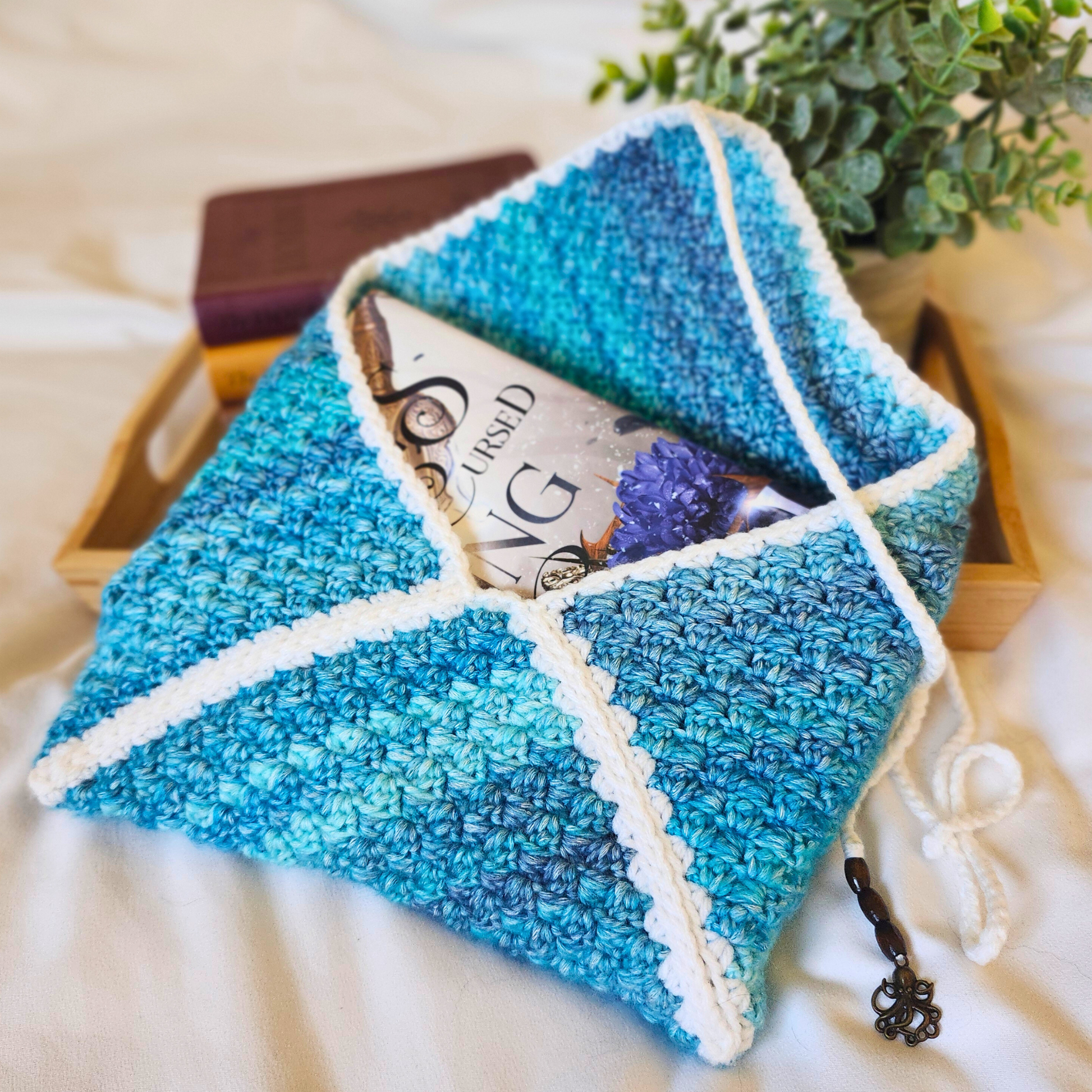 This beautiful, hand crocheted book sleeve is envelope style, with a single wrap-around cord and wooden beads tassel. Large enough to comfortably fit books measuring 22cmX14cmX4cm.